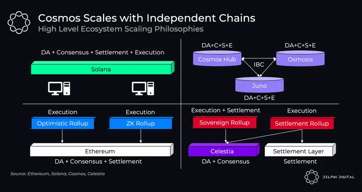 While app-chains of Cosmos are monolithic, handling all parts of protocol DA+C+S+E in one layer, they are often built using a modular software stack including consensus engine Tendermint, execution module Cosmos SDK, and the ABCI interface that sits in between. This gives developers the ability to easily spin up new chains with custom execution environments (eg. CosmWasm, EVM) and leverage IBC for secure cross-chain communication.