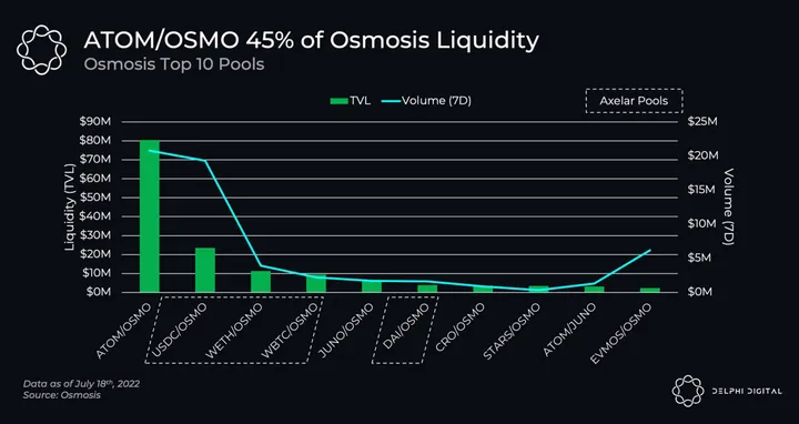 Osmosis has more coming in the future besides being just an AMM. There are NFTs coming, order books and borrowing/lending. The first iteration to come is from Mars protocol (a Delphi Labs incubation), launching CosmWasm smart contracts on Osmosis to allow users to leverage their LP positions. While Osmosis supports CosmWasm smart contracts, they are not permissionless, but rather whitelisted by validators. More recently, Osmosis voted to onboard Axelar as its canonical bridge for non-IBC assets, and pools with Axelar assets now make up 4 of the top 6 on the chain. These are non-IBC assets bridged from Ethereum: USDC, WETH, WBTC & DAI.