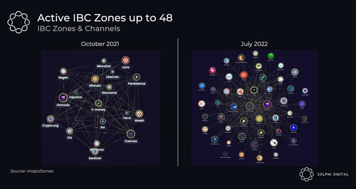 The maturity and modularity of the Cosmos software stack have been the biggest catalysts of its growth. While Cosmos is by no means a new ecosystem, its Inter-Blockchain Communication (IBC) protocol went live just over a year ago and there are now 48 active zones/chains. (For more on Cosmos, you can read our previous report on it here.)