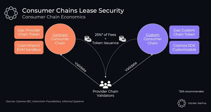 - Contract consumer chain: these chains run smart contract sandboxed environments (e.g CosmWasm or the EVM). While they are a lot easier for provider chain validators to assess as candidates, they do lose some flexibility. Consumer chains use the provider chain’s token (eg. ATOM) as gas. 25% of fees go to the provider chain and the remaining (~75%) go to a developer DAO, governed by the consumer chain’s own token.