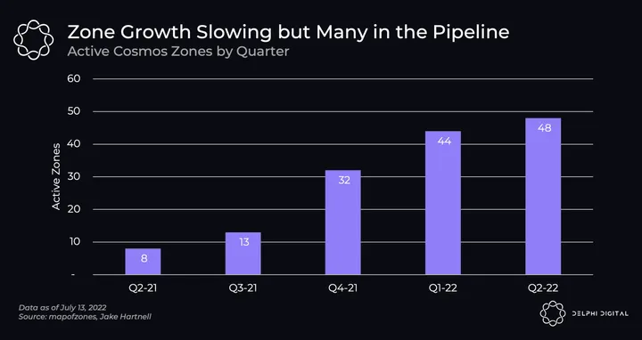 After launching IBC in 2021, the Cosmos ecosystem showed consistent growth of new zones (chains) through Q1-2022 before slowing down a bit in Q2. The slowdown is likely to be temporary, however, as numerous protocols in development and the launch of Interchain Security in August-September will allow chains to deploy quicker.