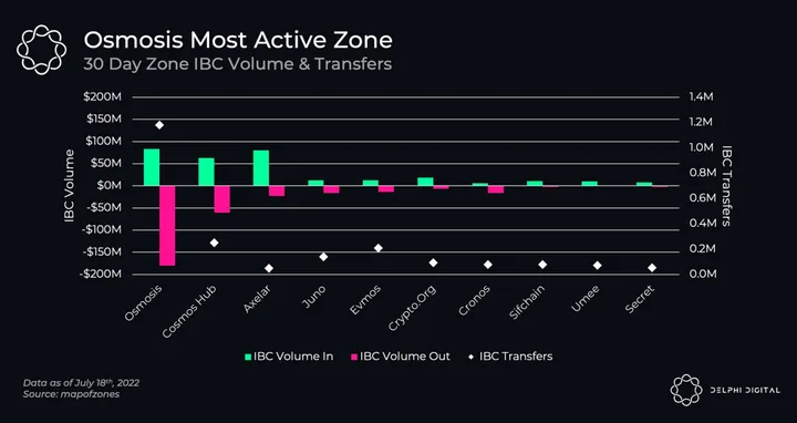 When thinking about Cosmos & IBC, the Hub (ATOM) is generally what comes to mind. The original thesis for the Cosmos Hub was to be the main zone users would route through in IBC, but that narrative has been challenged heavily over the past year with Osmosis, the Interchain AMM, consistently surpassing the Hub in transfer value as the main liquidity hub in the ecosystem. More recently, Axelar has begun to carve out a place connecting chains outside of IBC like Ethereum, Polygon, Avalanche, Fantom and Moonbeam.